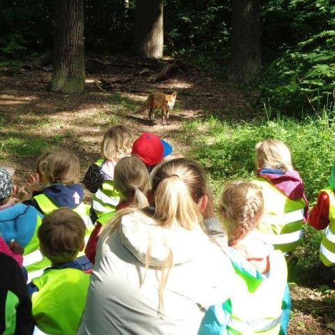 Noch spannender wird es, wenn wir anschließend vor die Tür treten. Hier lauschen, beobachten, entdecken, begreifen und erfahren wir spielerisch, wer was womit und warum im Wald macht.